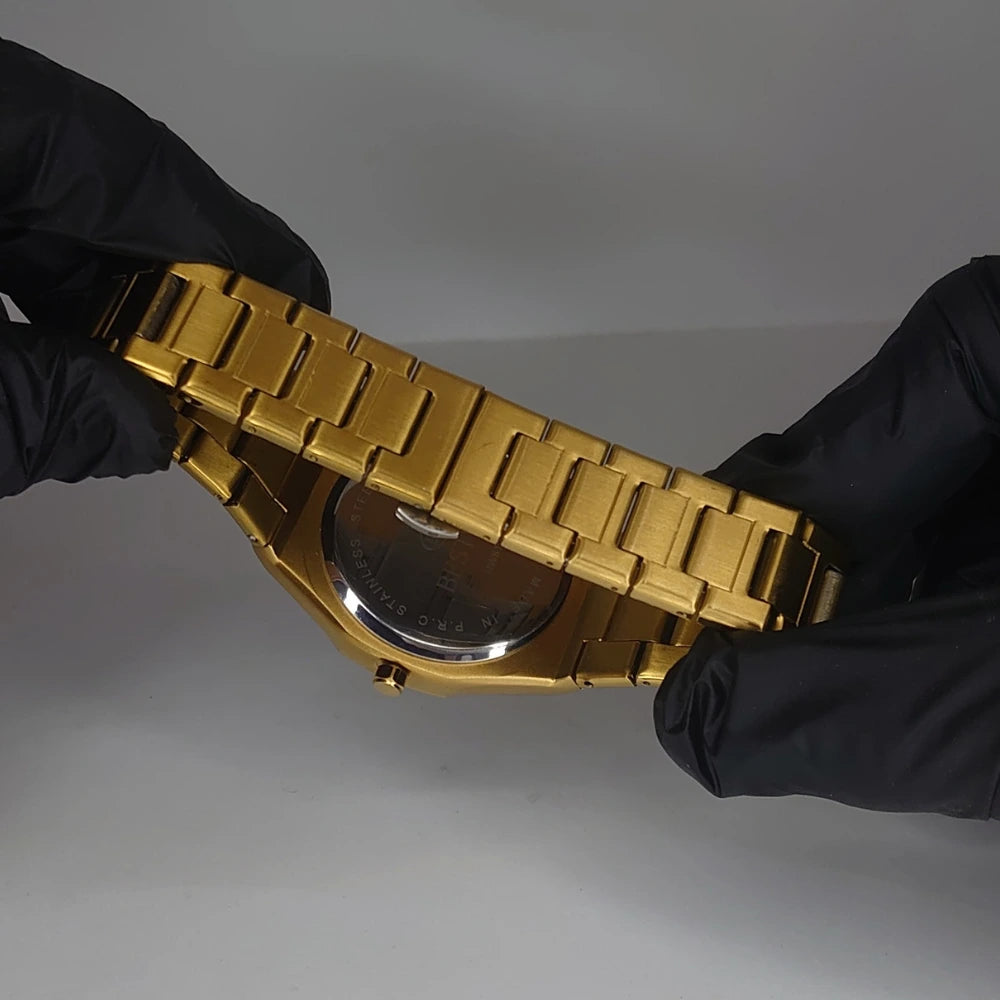 "Discover the elegant B.W luxury wristwatch featuring a gold-toned stainless steel band and case, paired with a stunning skeleton dial design that showcases its intricate mechanical movement. Perfect for those who appreciate timeless style and modern craftsmanship."